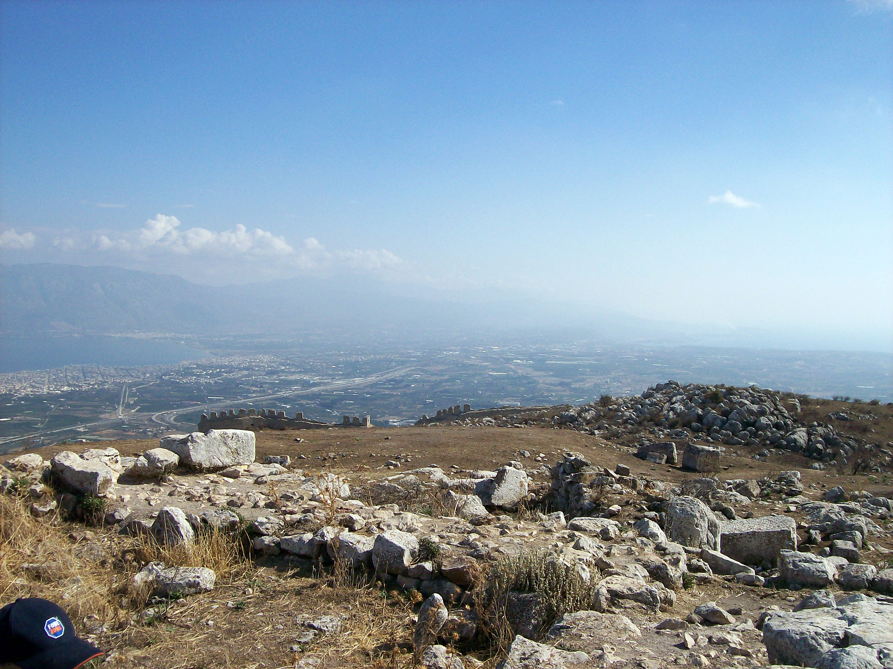 The ruins of the temple of Aphrodite, the divine patroness of Corinth with its six columns on the Acrocorinth that overlooked this city.