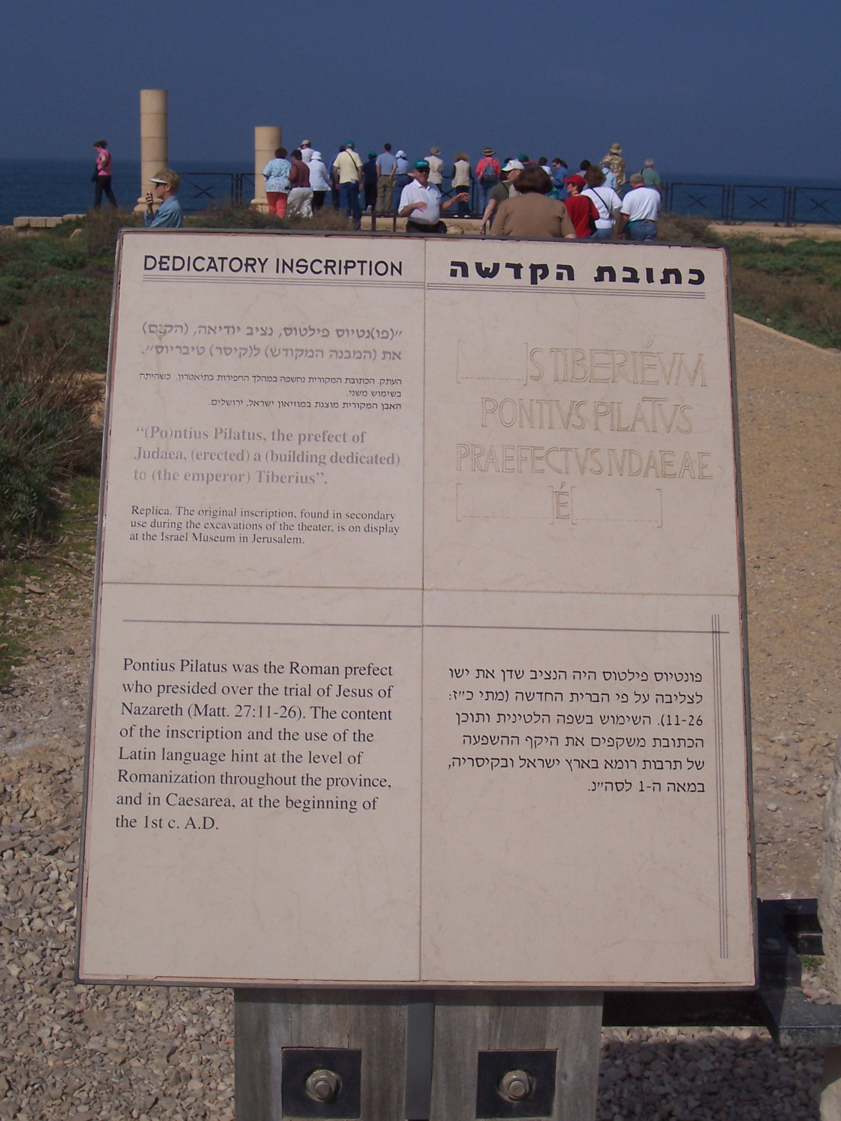 The inscription on the shrine that Pontius Pilate dedicated to the emperor in Caesarea Maritima, the capital of Judea, a city built by Herod the Great that was dominated by an imperial cult temple he also constructed.